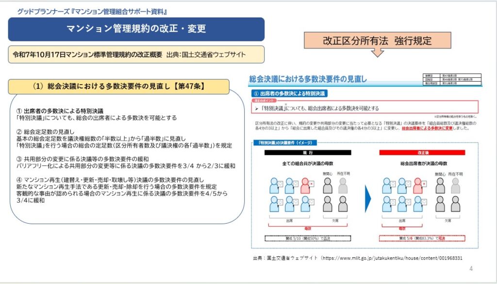 2026年4月施行の改正区分所有法に対応するための主な改正条文を解説する「国土交通省のウエブサイト」から重要な注意点をお知らせする「標準管理規約改正講座」の第1回は、多数決要件です。
