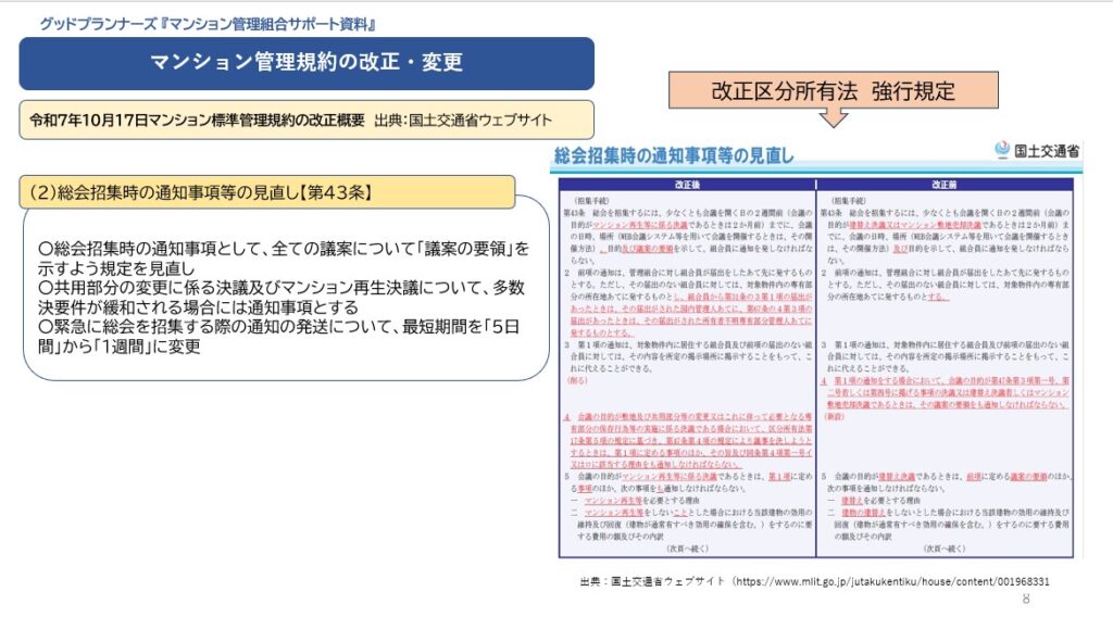 2026年4月施行の改正区分所有法に対応するための主な改正条文を解説する「国土交通省のウエブサイト」から重要な注意点をお知らせする「標準管理規約改正講座」の第⑤回は、総会招集時の通知事項の見直しです。